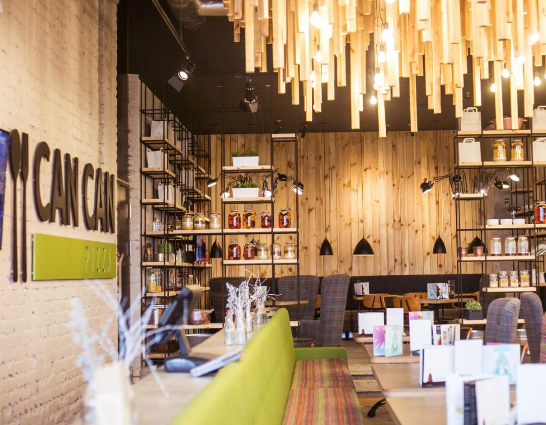 Can Can Pizza on yksi Liettuan ja Latvian suosituimmista pikaruokaketjuista. Keittiön tavoin sisustukseen on haettu inspiraatiota useista eri suunnista. Lopputuloksena on sulava tyylien ja ilmeiden yhdistelmä, jossa Nevotexin huonekalukankaat ovat tärkeitä yksityiskohtia kokonaisuudessa.