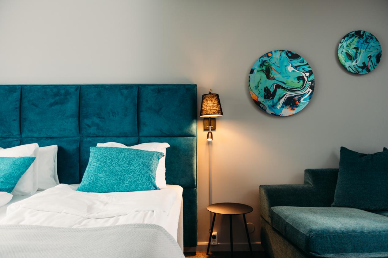 Jotta huoneisiin saatiin lämmin ja maanläheinen tunnelma, niissä käytettiin erilaisia Nevotexin kulutusta kestäviä kankaita, joissa oli monenlaisia tekstuureja sekä erilaisia turkoosin ja kuparin sävyjä.